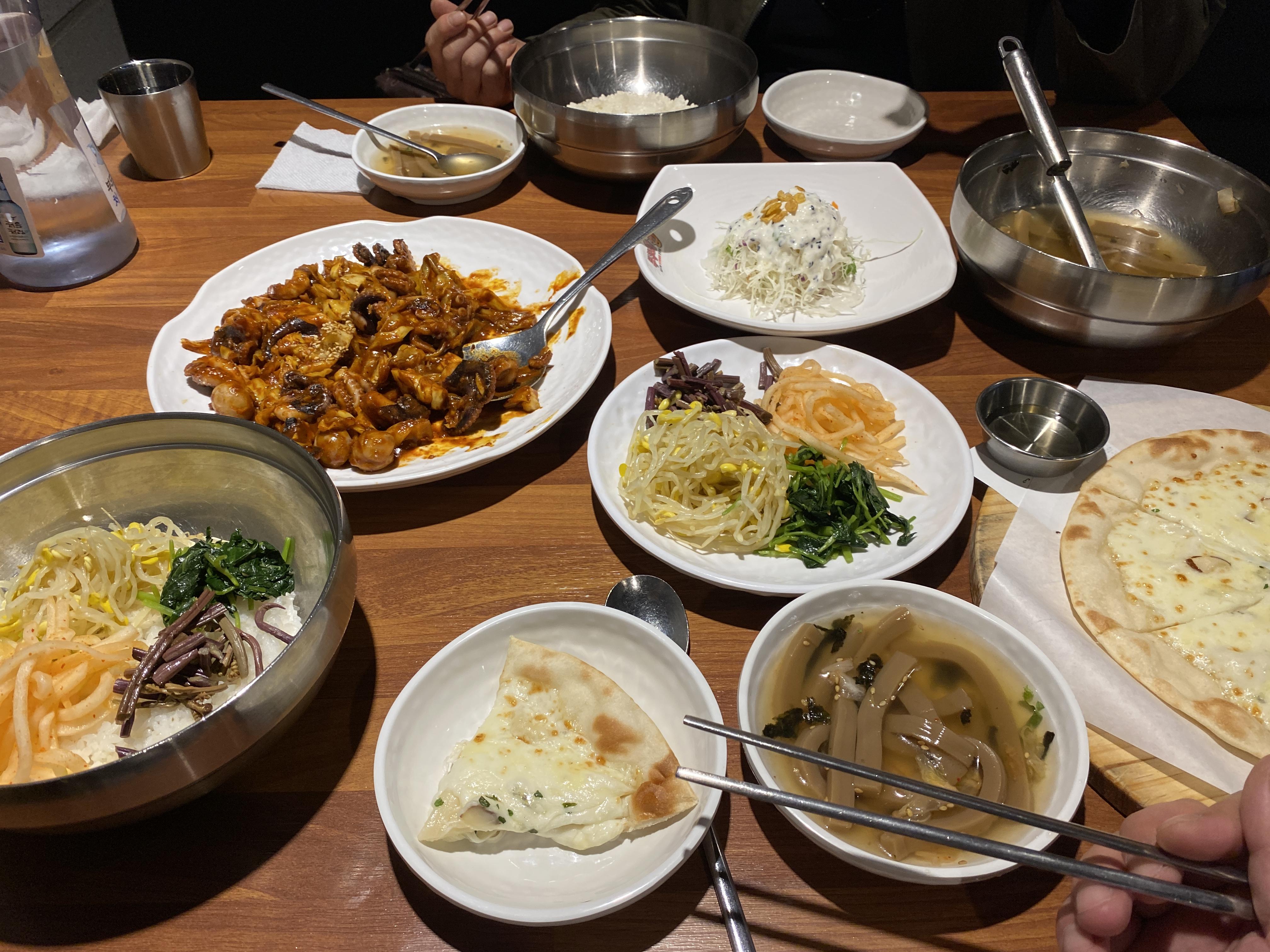 1인 1만원이며 쭈꾸미볶음과 고르곤졸라피자, 묵사발, 샐러드 구성이에요.